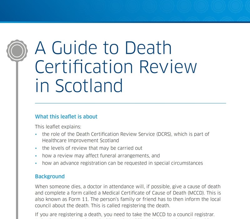 Healthcare Improvement Scotland's DCRS have a digital leaflet providing guidance on death certification review in Scotland - please visit the Healthcare Improvement Scotland DCRS website to access this document.