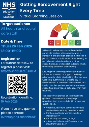NHS Education for Scotland (NES) has created two learning sessions, Getting Bereavement Right Every Time, to help health and social care staff feel more confident and supported in these moments. The sessions have already received excellent feedback, and we’re delighted to offer repeat opportunities to attend.