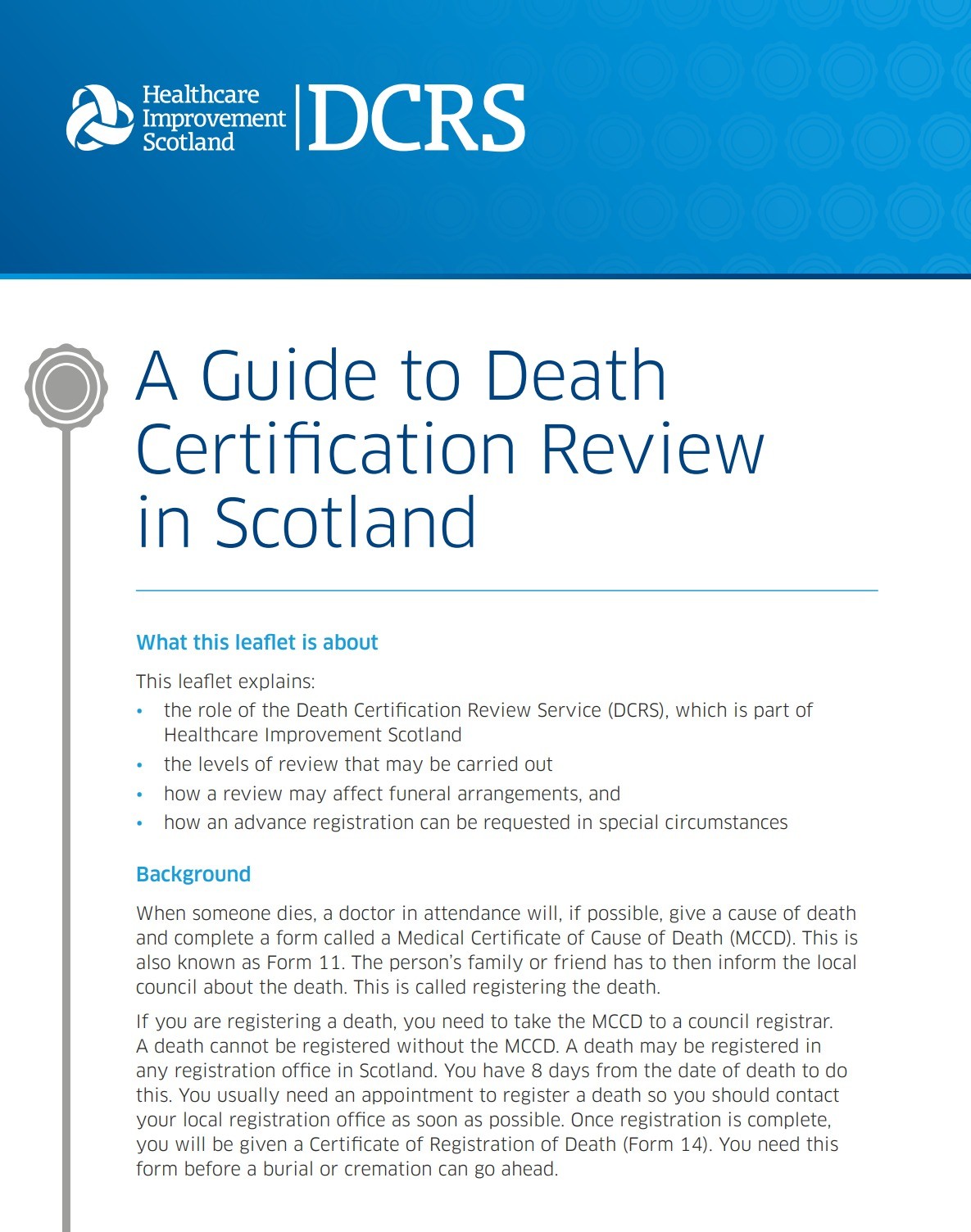 Healthcare Improvement Scotland's DCRS have a digital leaflet providing guidance on death certification review in Scotland - please visit the Healthcare Improvement Scotland DCRS website to access this document.
