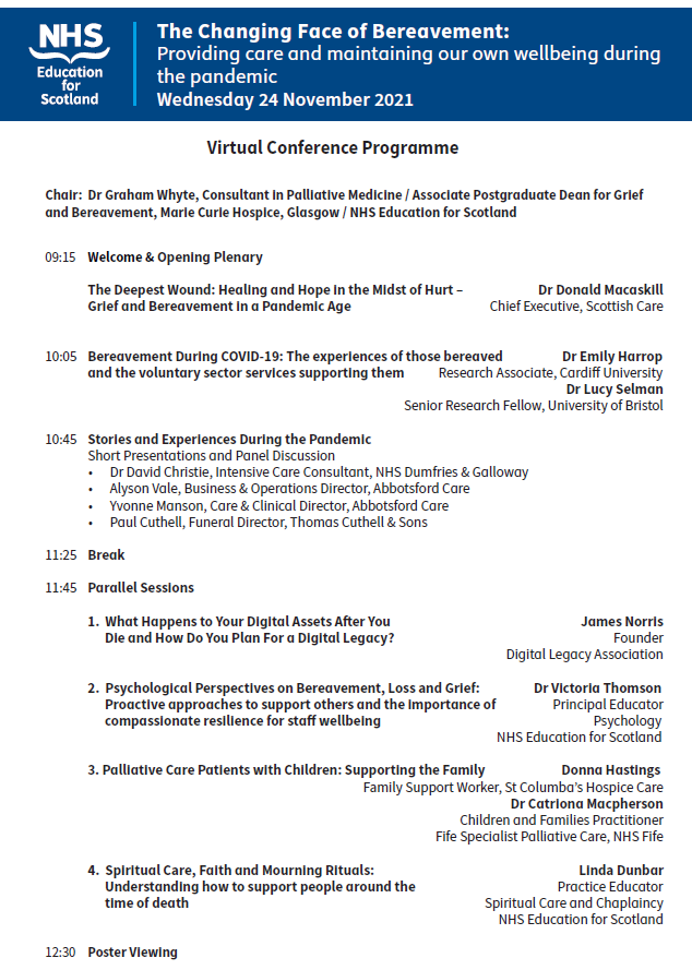 This one-day, virtual event attracted interest from over 1000 Health and social care professionals from across Scotland and beyond. Delegates heard from a wide range of speakers on bereavement-related topics relevant to those working across health and social care.