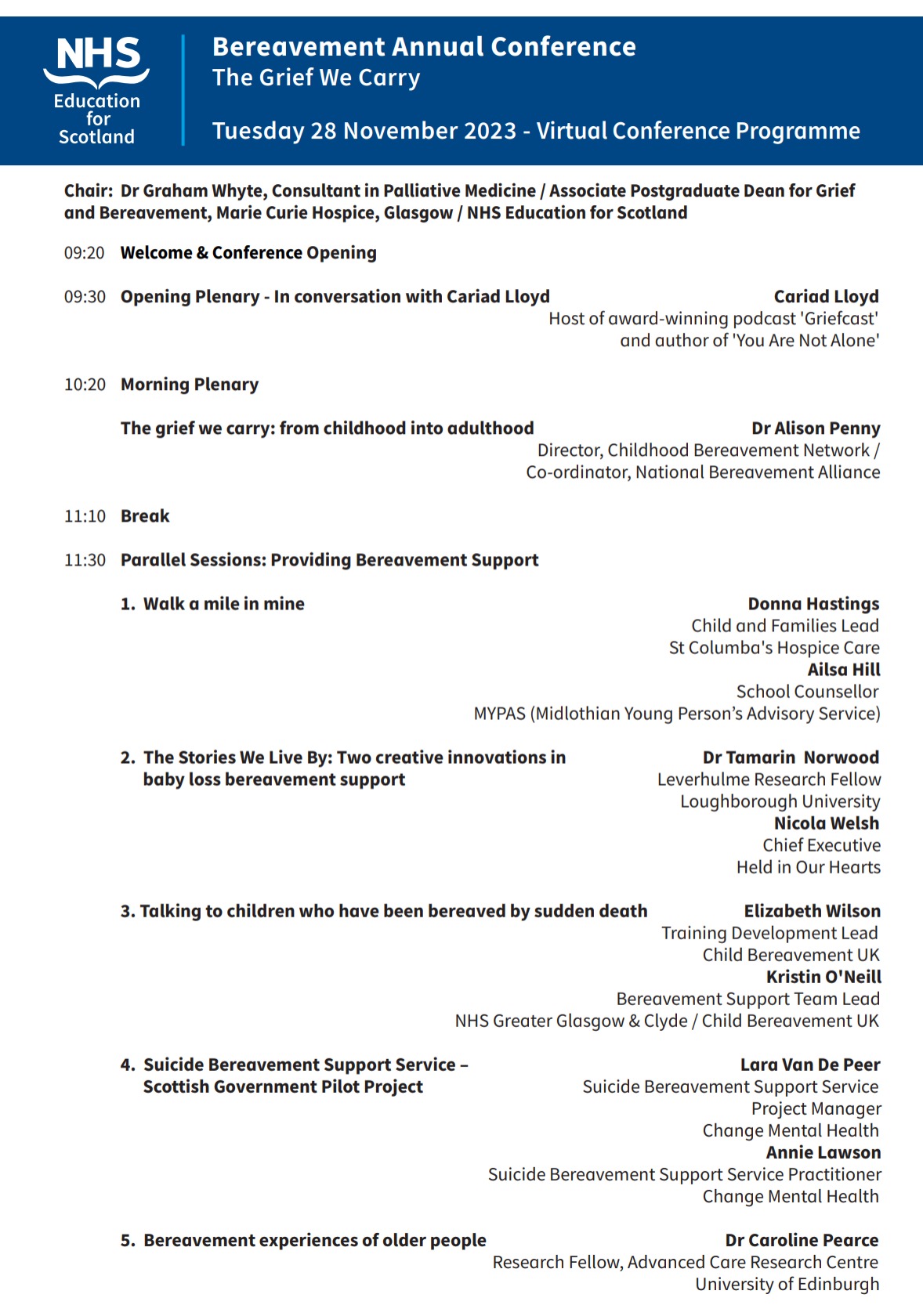 NHS Education for Scotland's 4th bereavement education conference took place on Tuesday 28th November. The morning programme focussed on providing bereavement support in different circumstances (e.g., bereavement experiences of older people, children following a sudden death and those bereaved by suicide). The afternoon programme focussed on staff wellbeing and bereavement in the workplace.